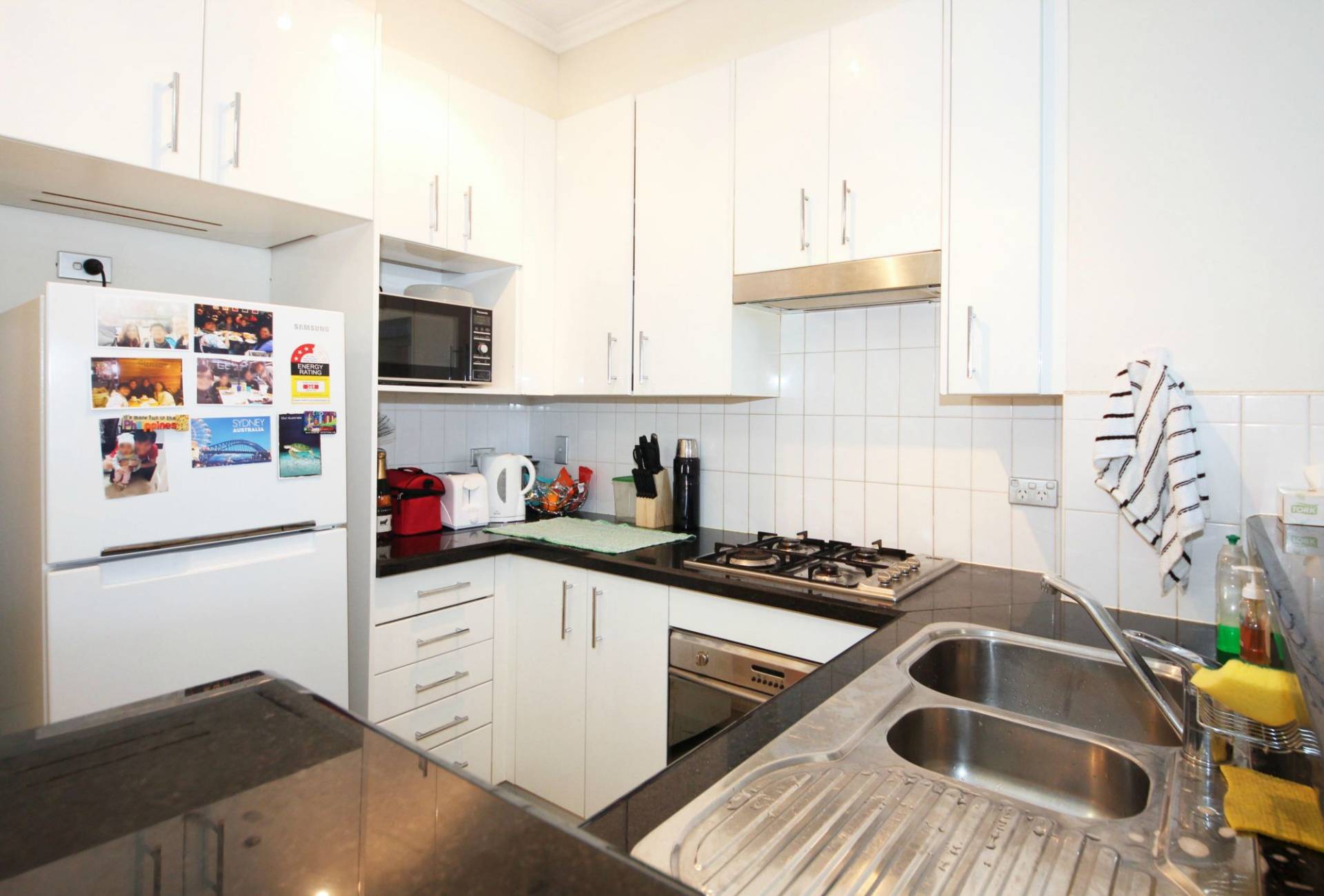 - Open plan kitchen with high quality stone bench tops and stainless steel appliances with gas cooking
