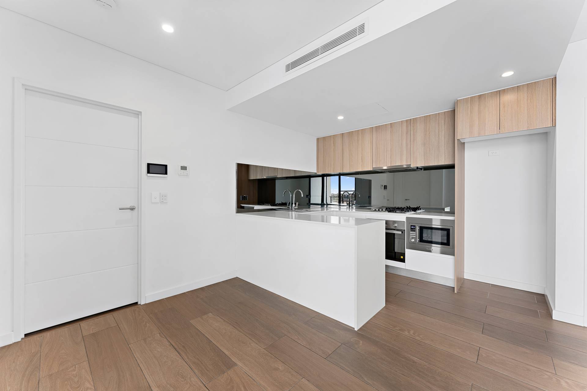- Stainless-steel kitchen appliances, including a built-in oven, a microwave oven, a gas cooktop and a dishwasher. Stone bench tops.