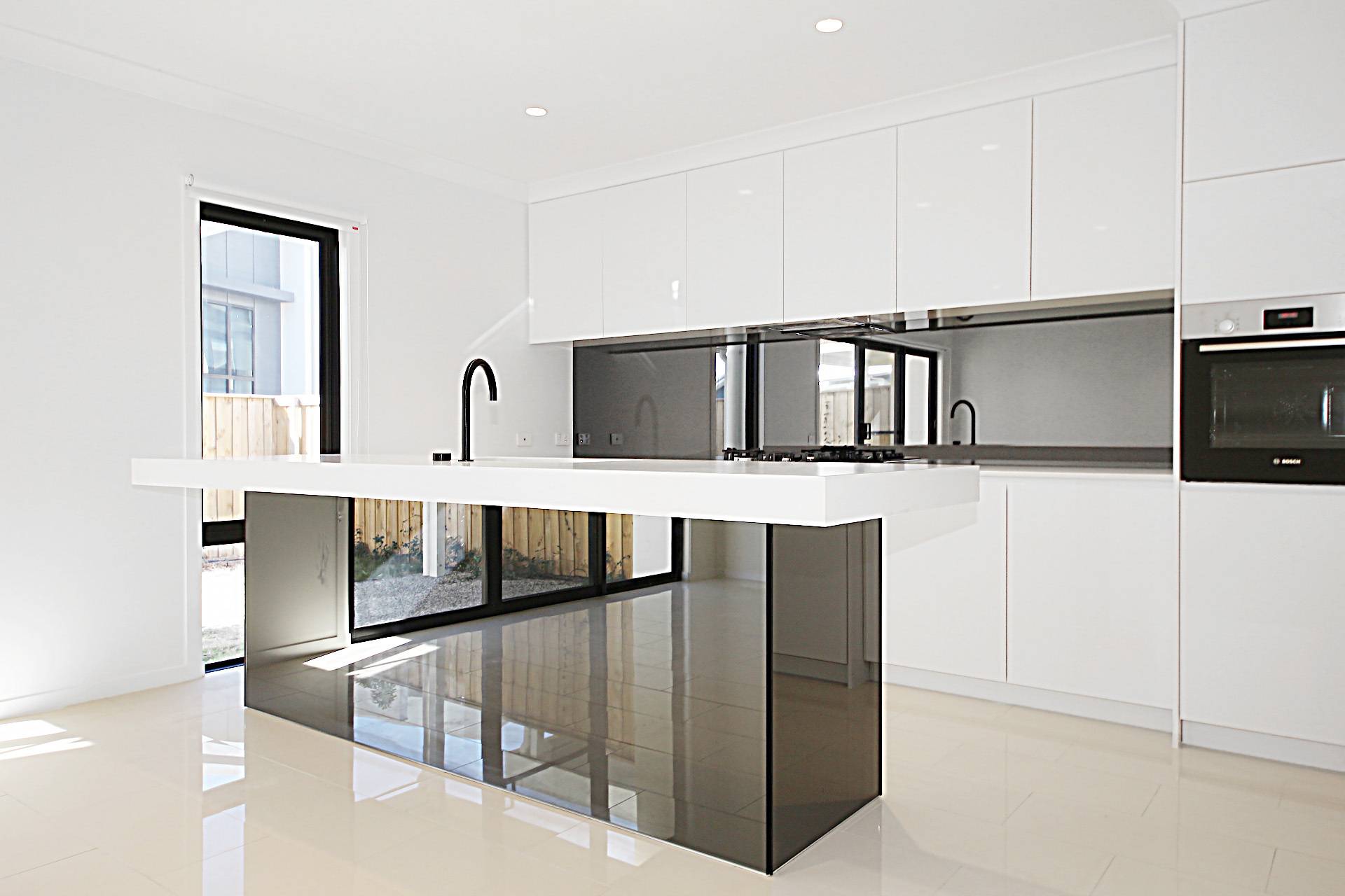 - Reconstituted stone kitchen benchtops and mirror splashback
