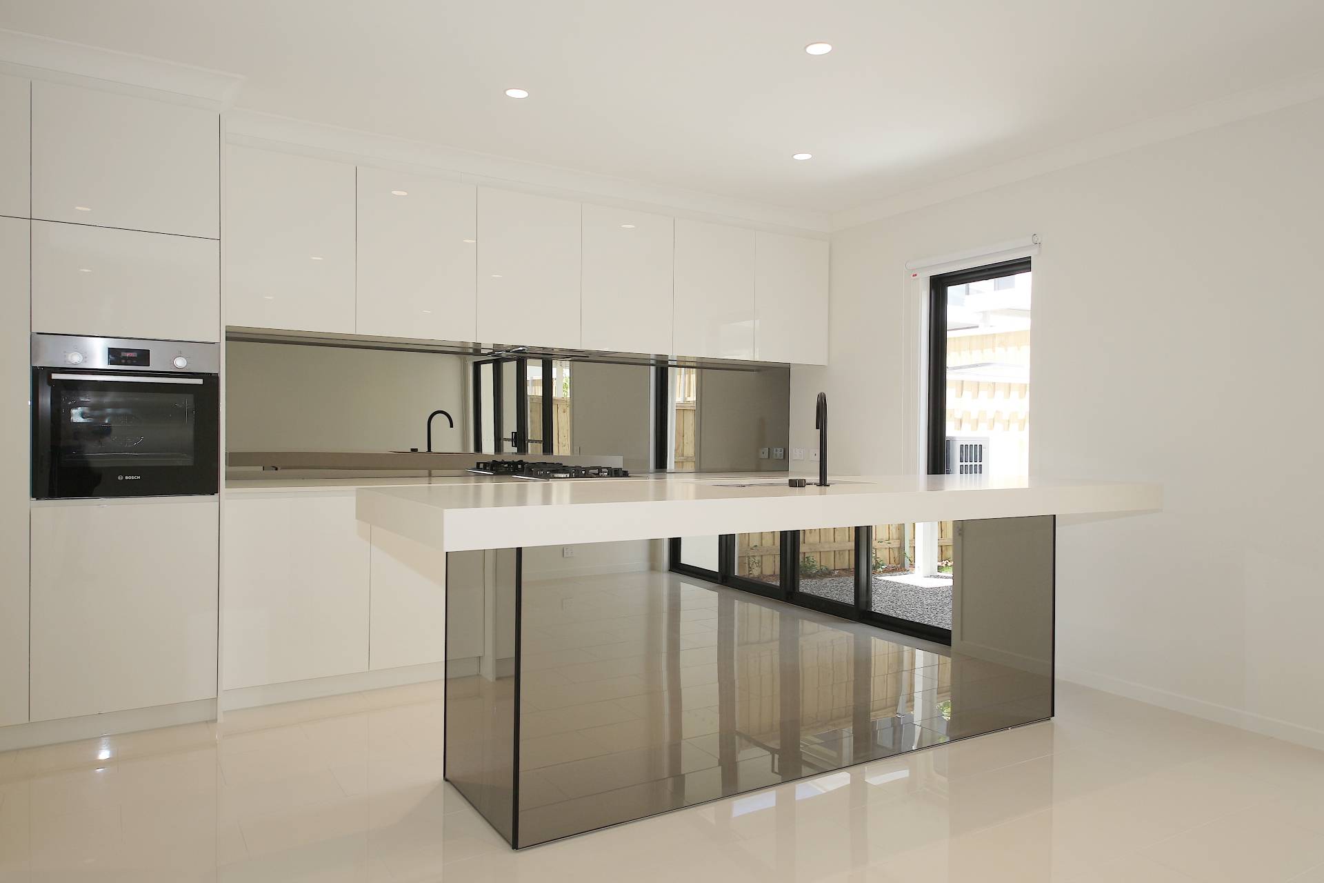 - Reconstituted stone kitchen benchtops and mirror splashback