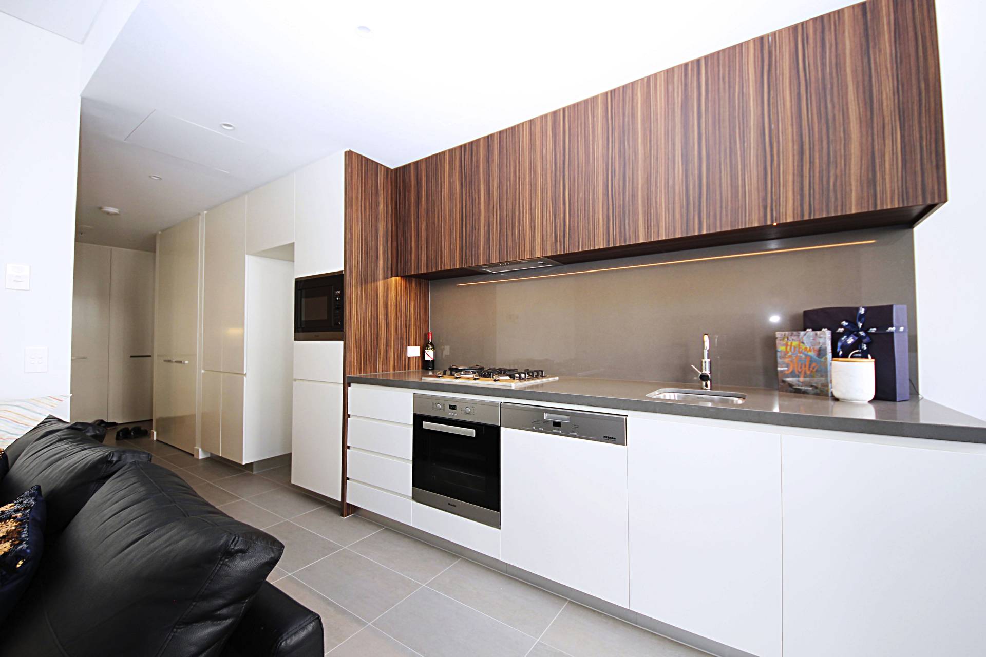 - Stone benchtop and Miele appliances in kitchen