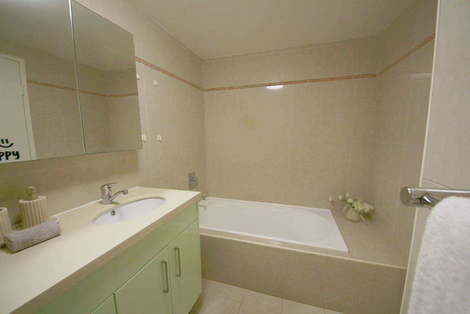 - Sleek bathroom features floor-to-ceiling tiles, internal laundry facilities,