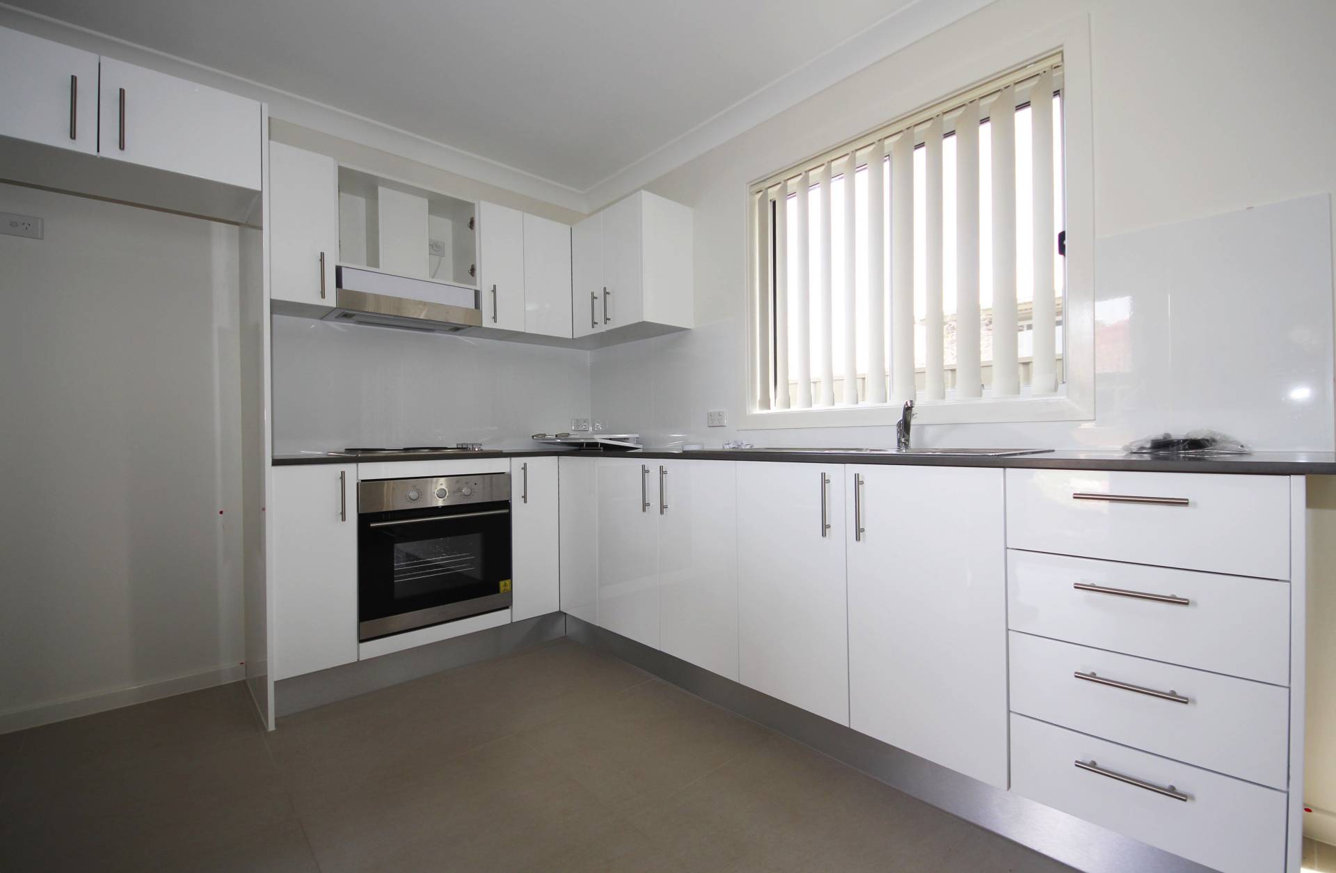 - Modern kitchen with stainless steel appliances, electric cook-top and caesar stone bench-top